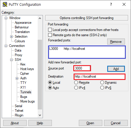 Connection > SSH > Tunnels