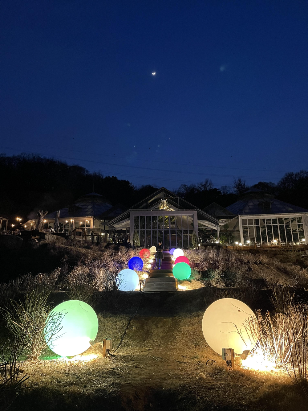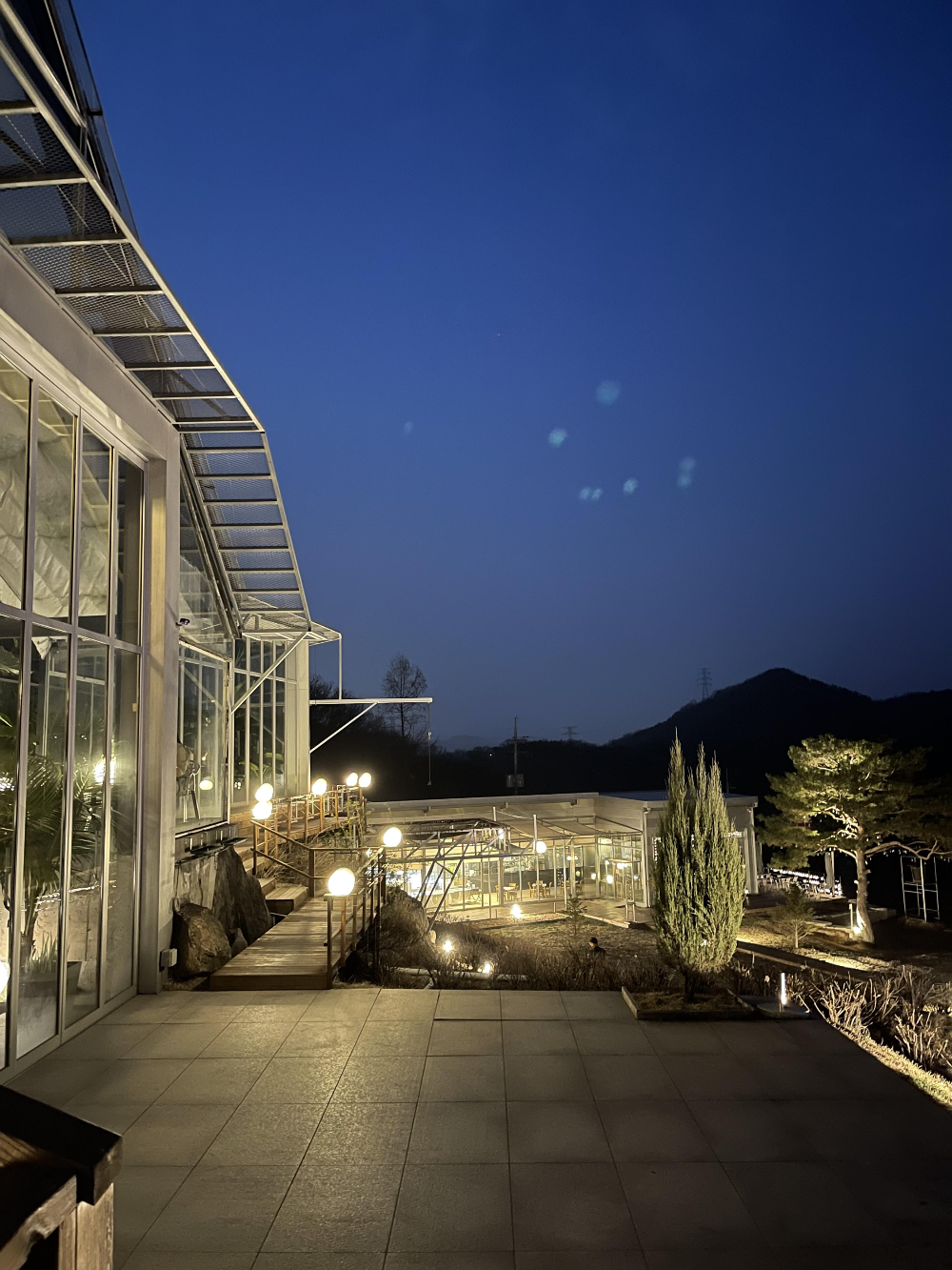아까 주차장에서 봤던 동그란 조명들을 양옆에 두고 계단을 오른다.