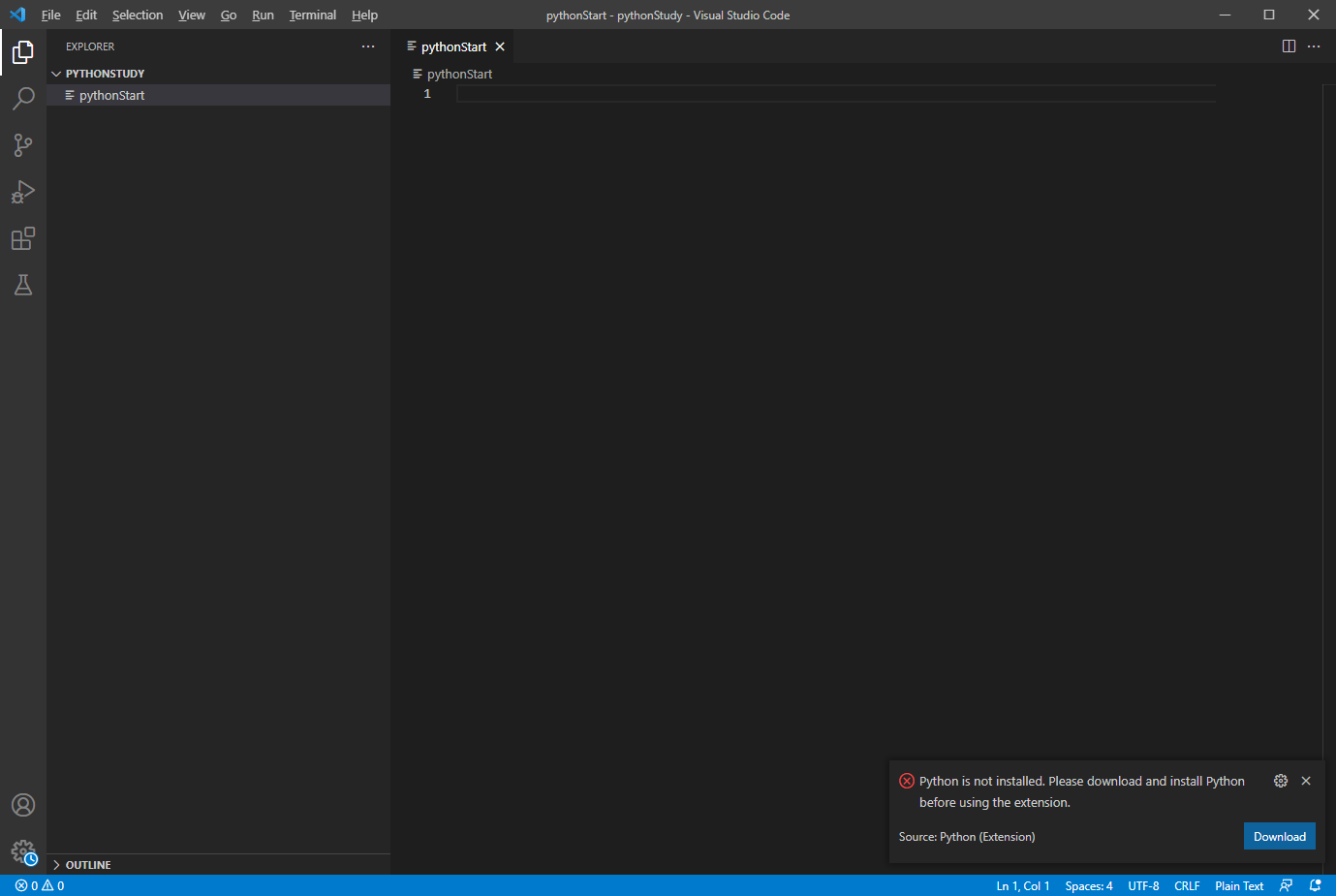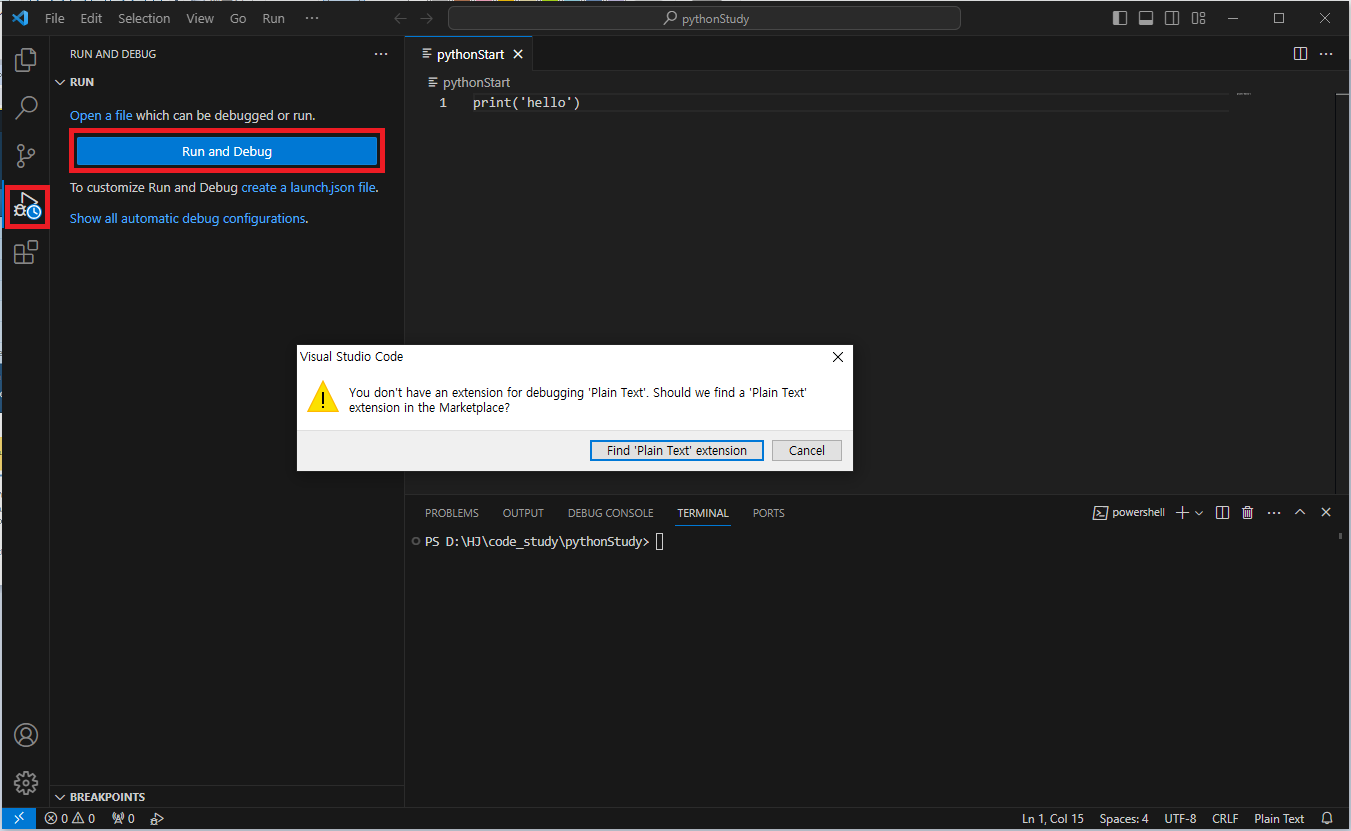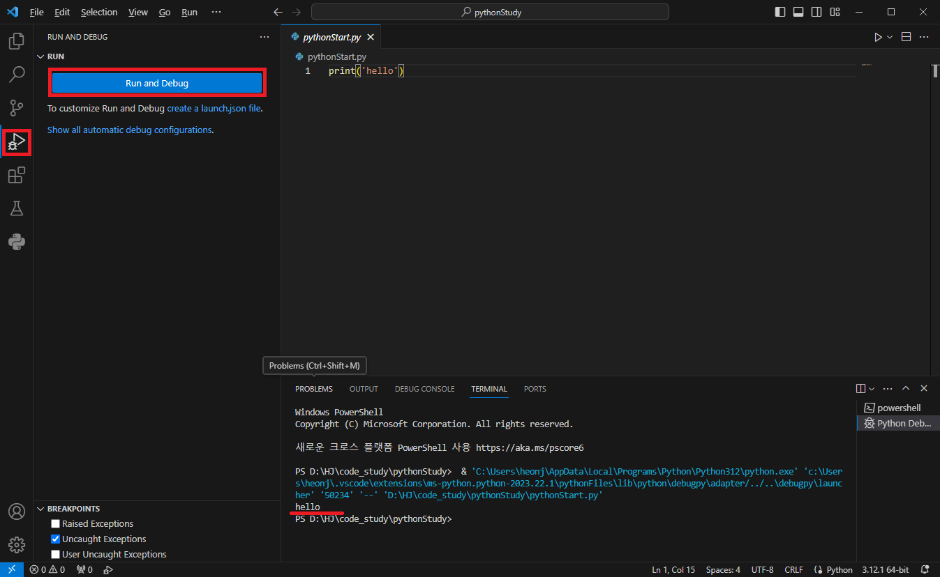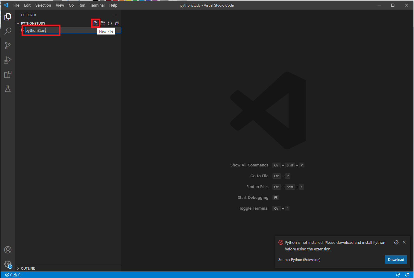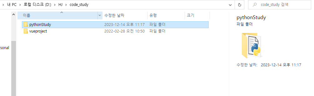 나는 pythonStudy라는 폴더명으로 생성해보았다.