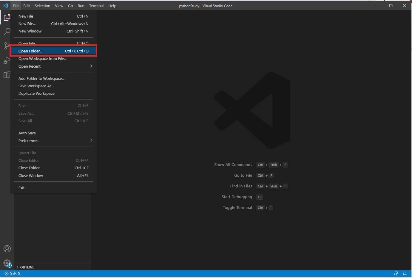 vscode에서 File > Open Folder 로 해당 폴더(프로젝트)를 연다.