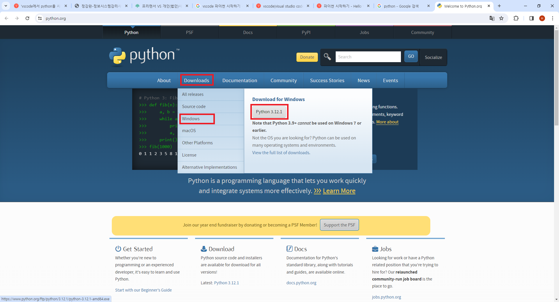 파이썬 사이트에서 받아본다.