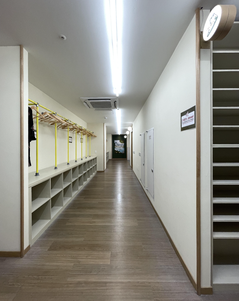 카운터를 지나 들어가면 신발장과 수납, 세족, 탈의 공간.