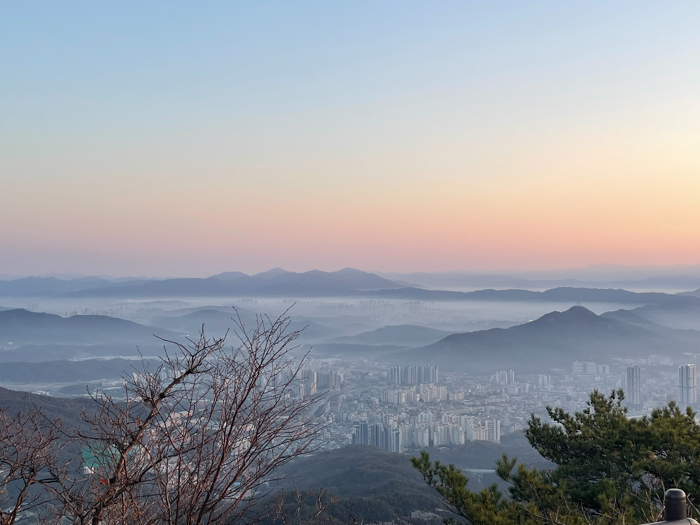 일출과 운무 깔린 도시 모습