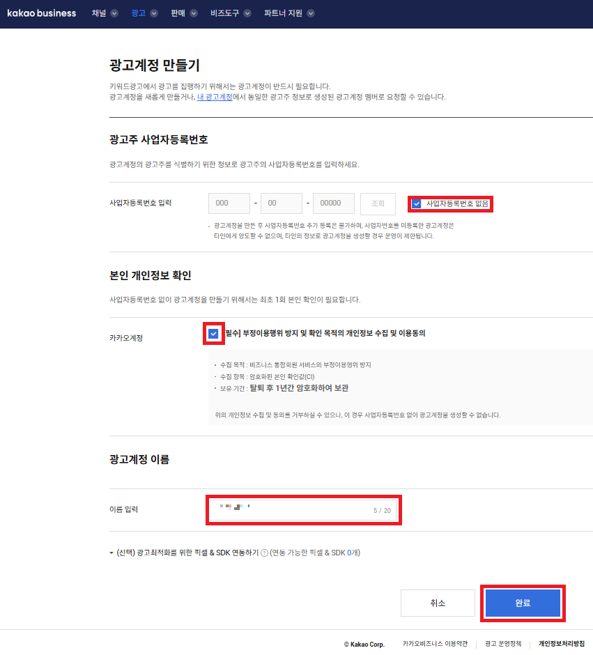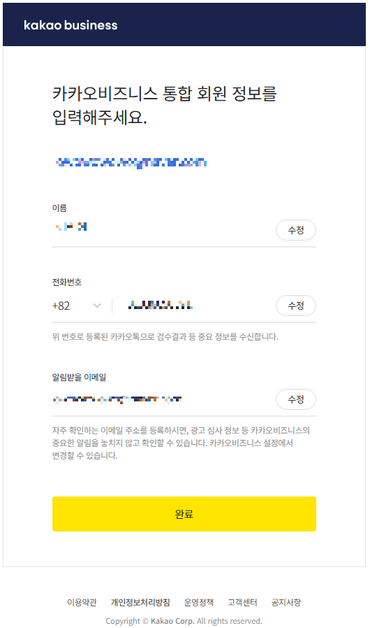 카카오 비즈니스 통합 회원 정보 입력하고 완료 버튼 클릭.
