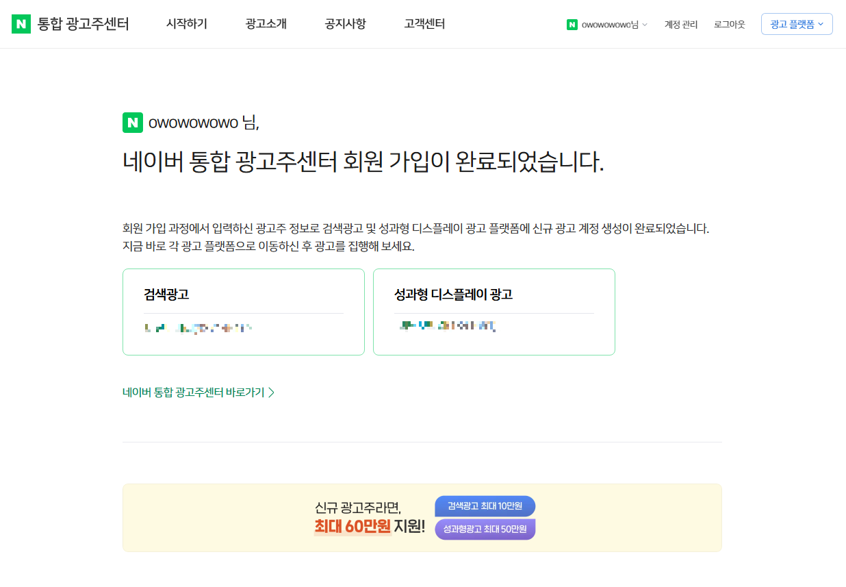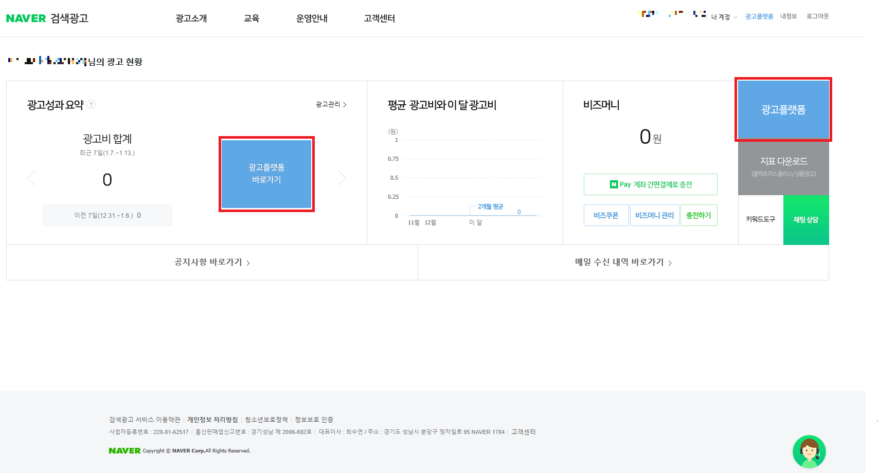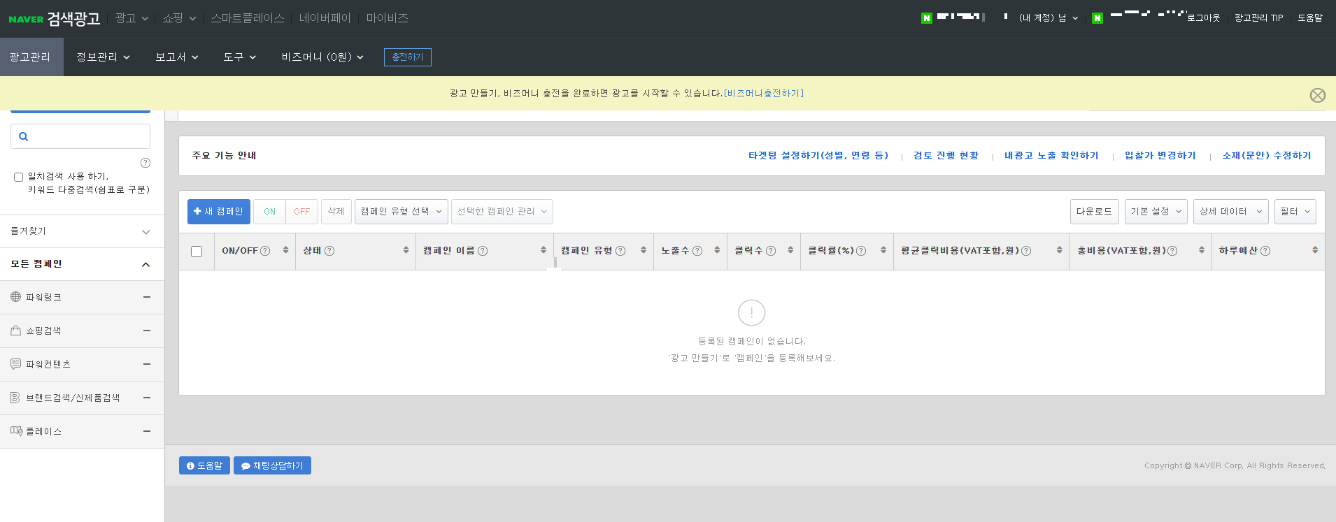 로그인 한 후 네이버 검색광고로 입장한 첫 화면이다.