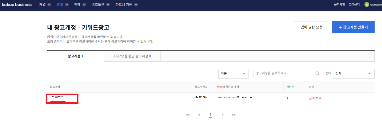 광고계정 만들 때 적었던 계정명이 목록에 뜨는데 계정명을 클릭해준다.