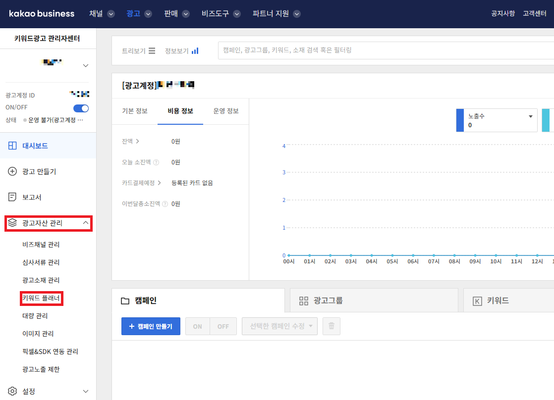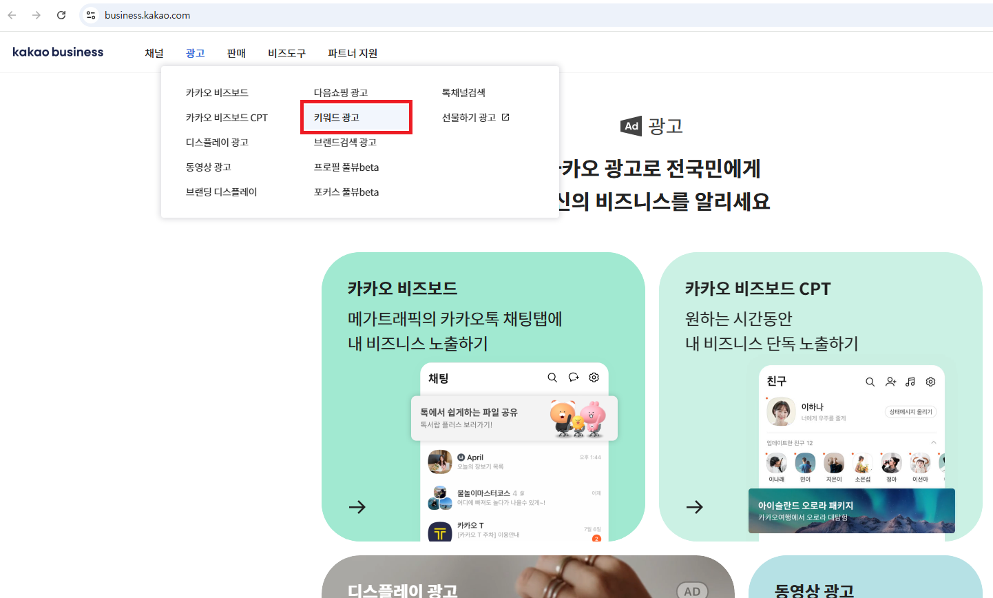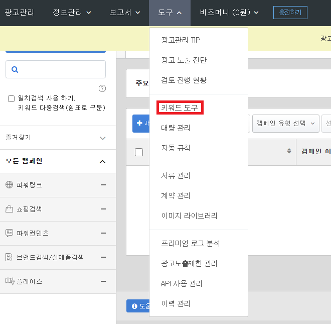 상단 탭에서 광고를 클릭하고 세부 항목에서 키워드 광고를 클릭한다.