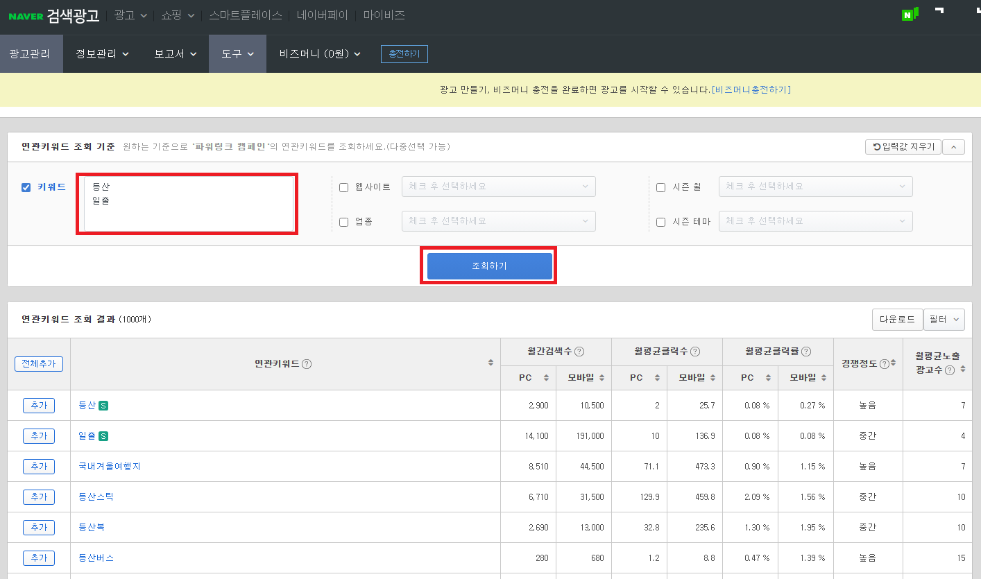 5. 키워드 입력칸에 검색어 넣고 조회하기