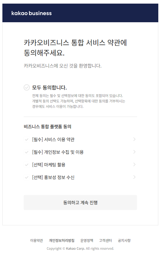 카카오로 로그인을 하면 자동으로 카카오비즈니스 회원가입으로 연결이 된다.