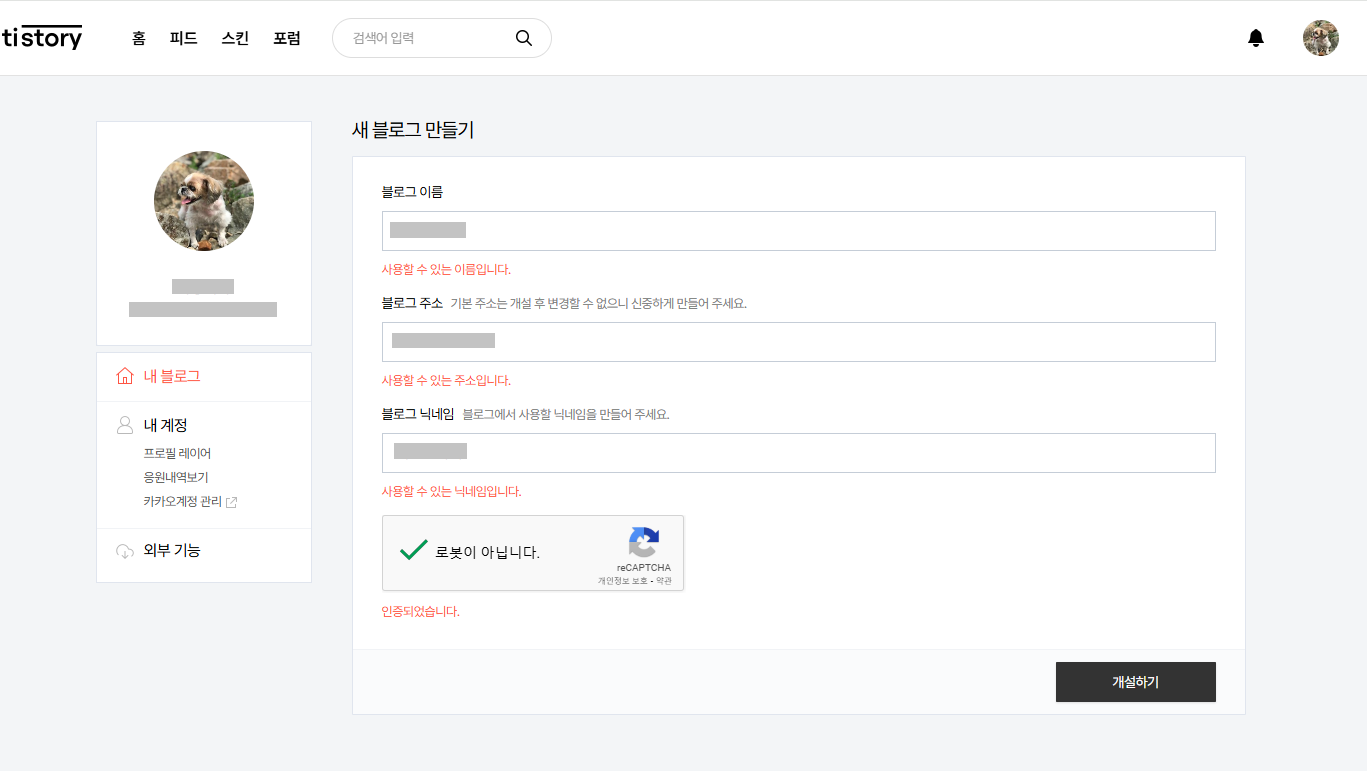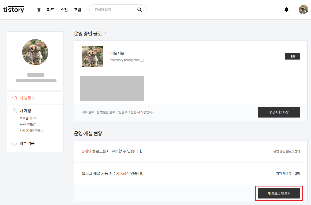 티스토리는 총 5개의 블로그를 생성할 수 있으며,