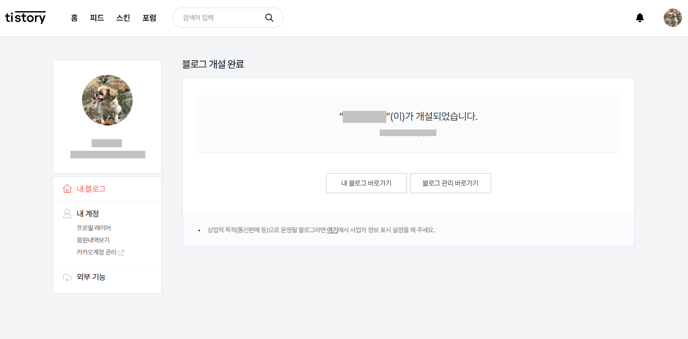 개설되었다는 안내 메시지가 뜨면서 블로그 생성이 완료되었다.