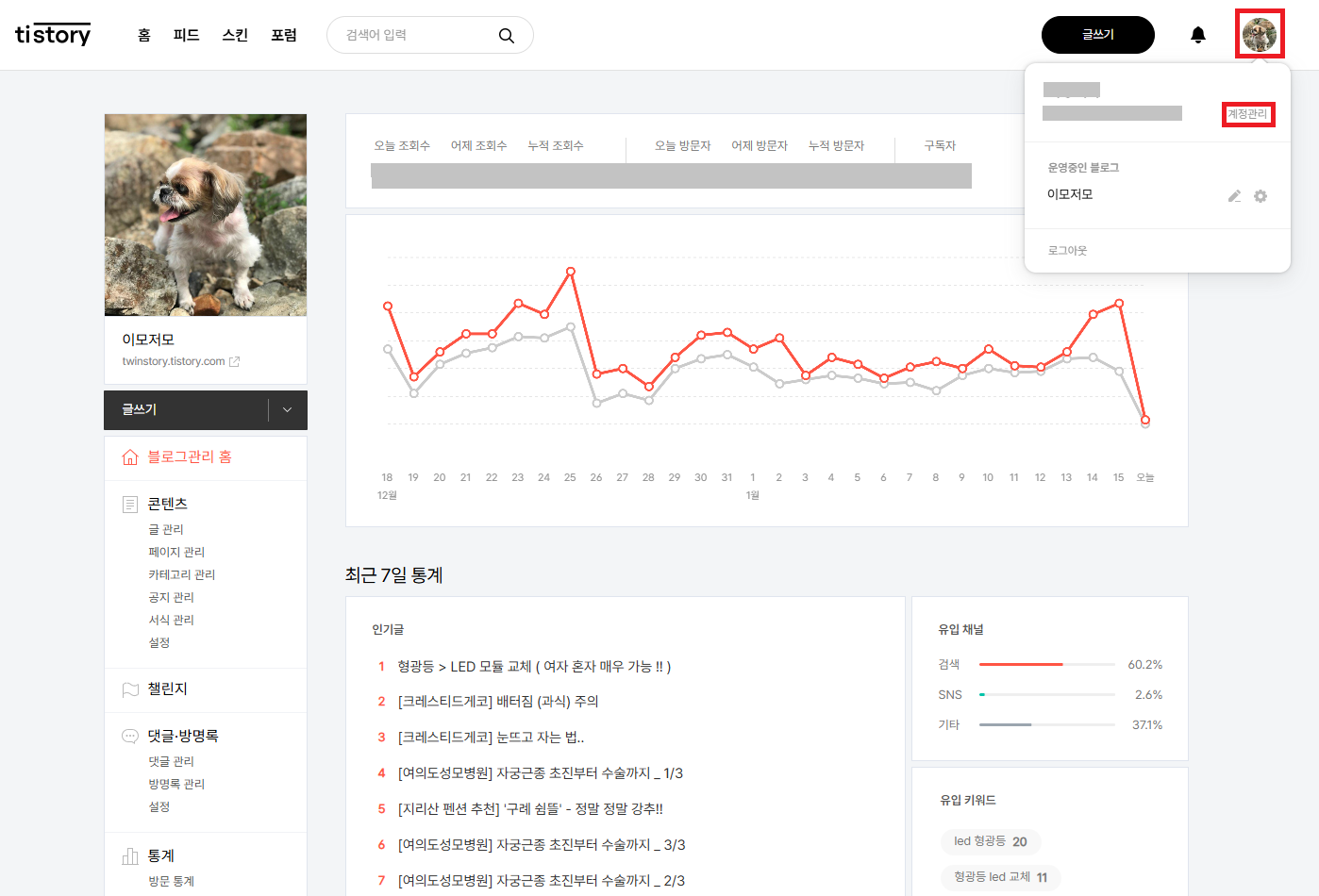 우측 상단 기본 계정 이미지를 누르면 내 계정 옆에 [ 계정관리 ] 가 뜬다.