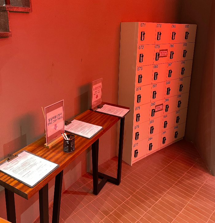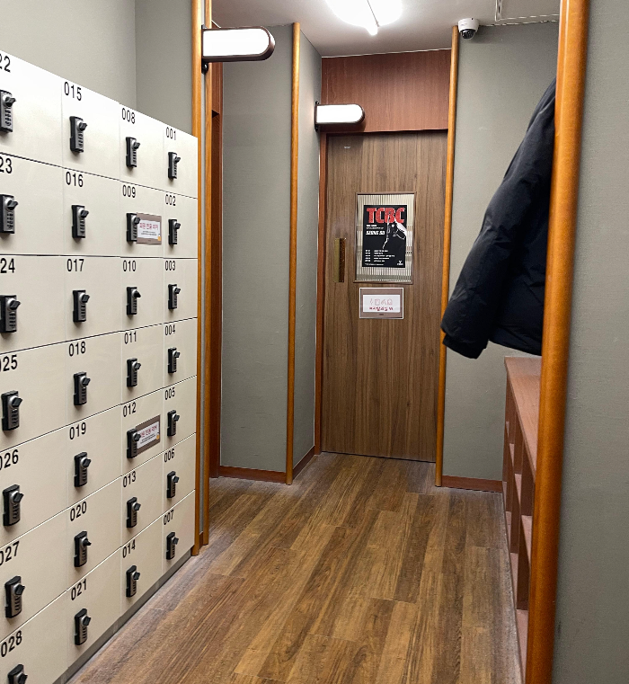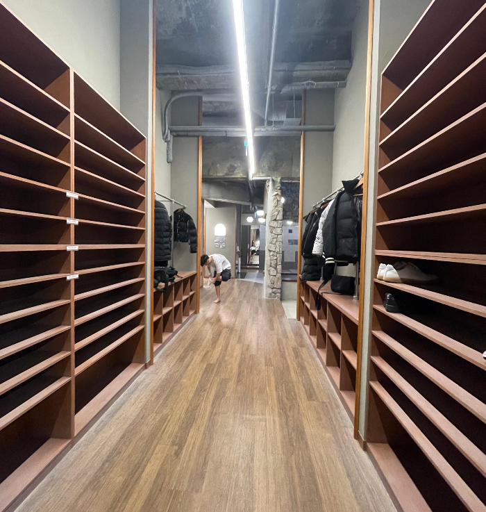 회원번호 누르고 입장하면 신발장과 수남장이 길게 이어져 있다.