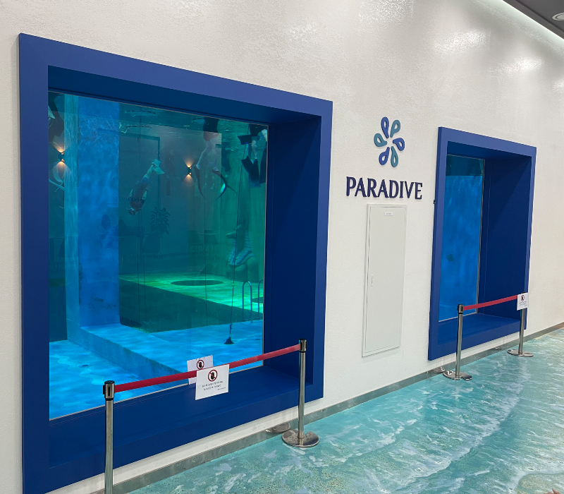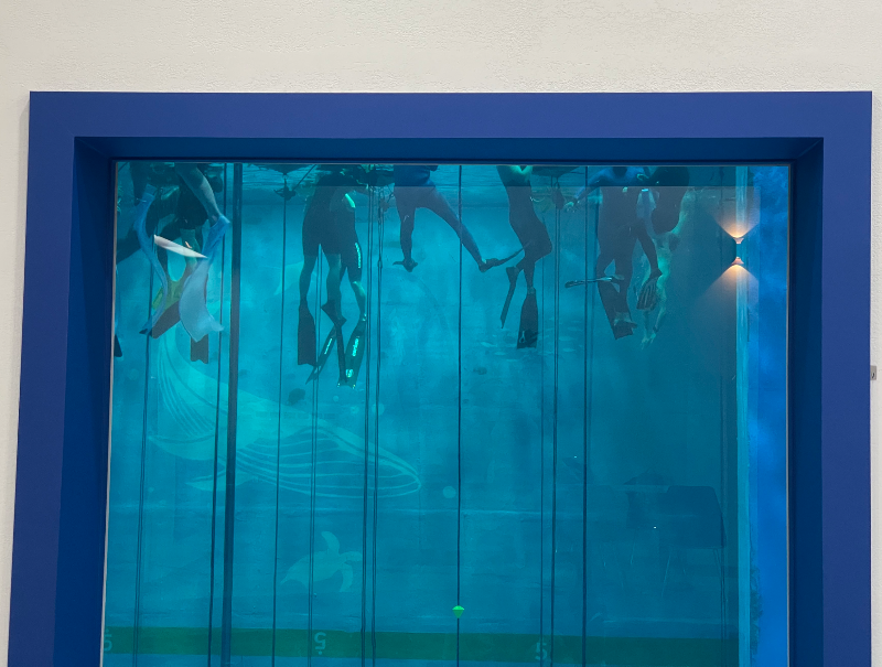 카페 앞에 잠수풀이 들여다보이는 창이 세개 있다.