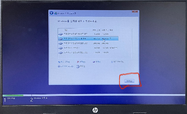 윈도우를 설치할 디스크를 선택 > [ 다음 ]